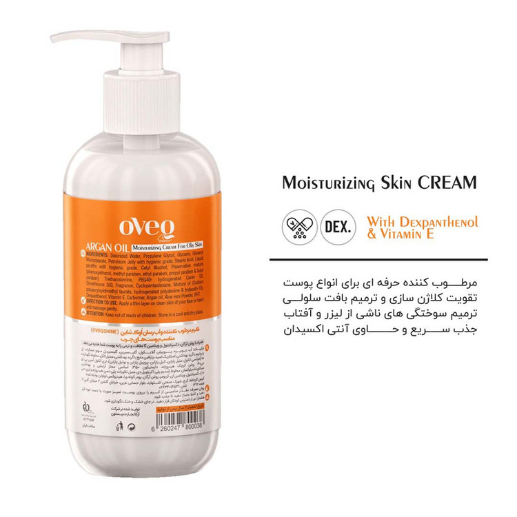 کرم مطوب کننده آرگان مخصوص پوست های چرب ،علاوه بر خواص مرطوب کنندگی و آبرسانی پوست حاوی دکسپنتانول، ویتامین ای، عصاره آلوئه ورا و روغن آرگان میباشد. دکسپانتنول سبب افزایش تکثیر فیبروبلاست و تسریع بازسازی پوست میشود. علاوه بر این محافظ، مرطوب کننده و ضدالتهاب پوست هم می باشد. ویتامین ای علاوه بر حفظ زیبایی و سلامت پوست در درمان انواع بیماریهای پوستی مانند آکنه، پسوریازیس و اثرات پیری ناشی از قرار گرفتن در معرض آفتاب، مؤثر میباشد. روغن آرگان سرشار از اسیدهای چرب است، اما دو نوع اسید چرب اسید اولئیک و اسید لینولئیک ویژهترین اسیدهای آن هستند. لینولئیک اسید، التهاب و آکنه پوست را کاهش داده و سطح رطوبت آن را تا حد خوبی بالا میبرد. اسید اولئیک هم اسیدی است که باعث افزایش نفوذپذیری پوست میشود و به دیگر مواد تشکیل دهنده روغن آرگان اجازهی نفوذ راحتتر و بیشتری را میدهد. گیاه آلوئه ورا سرشار از مواد مغذی و ویتامین E و C است که به جوان سازی پوست کمک میکند و سبب جوان سازی پوست و پیشگیری از پیری زودرس پوست میشود.