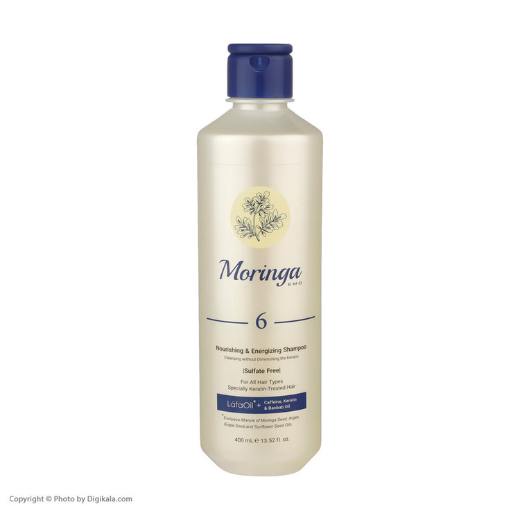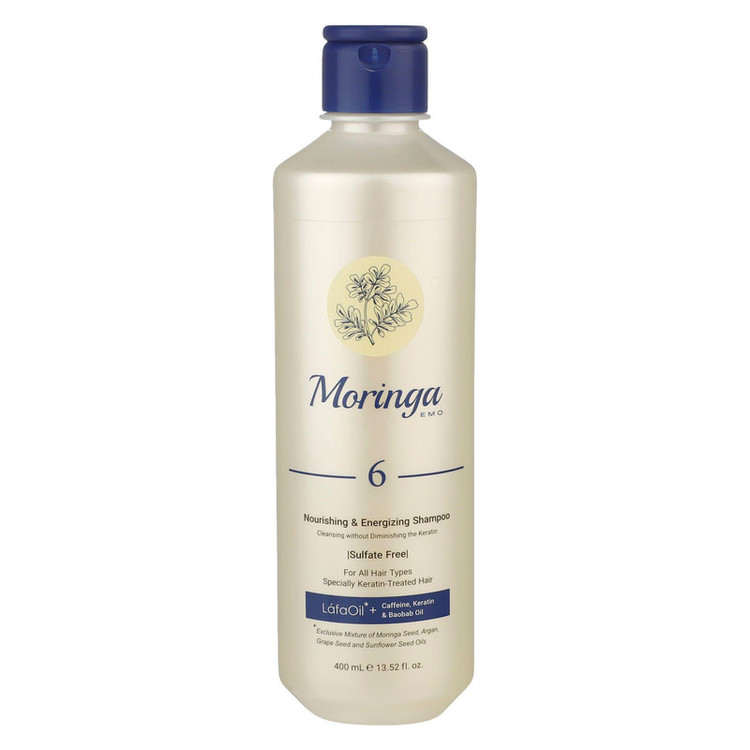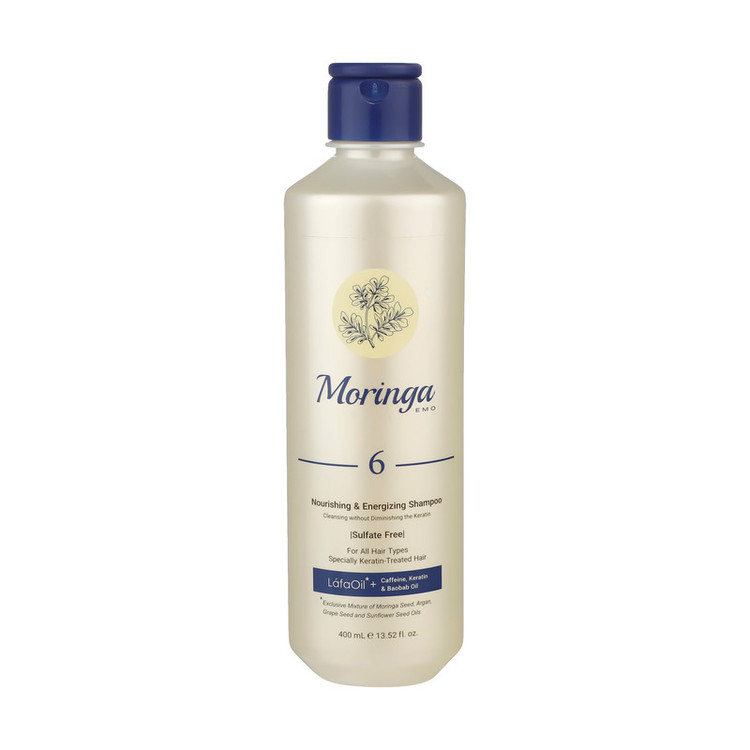 شامپو بدون سولفات مورینگا اِمو مدل 6 انواع مو به ویژه کراتینه 400 میلی‌لیتر