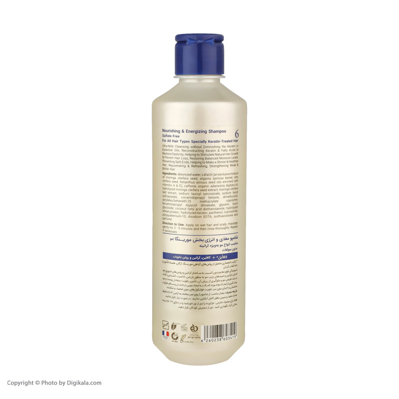 شامپو بدون سولفات مورینگا اِمو مدل 6 انواع مو به ویژه کراتینه 400 میلی‌لیتر